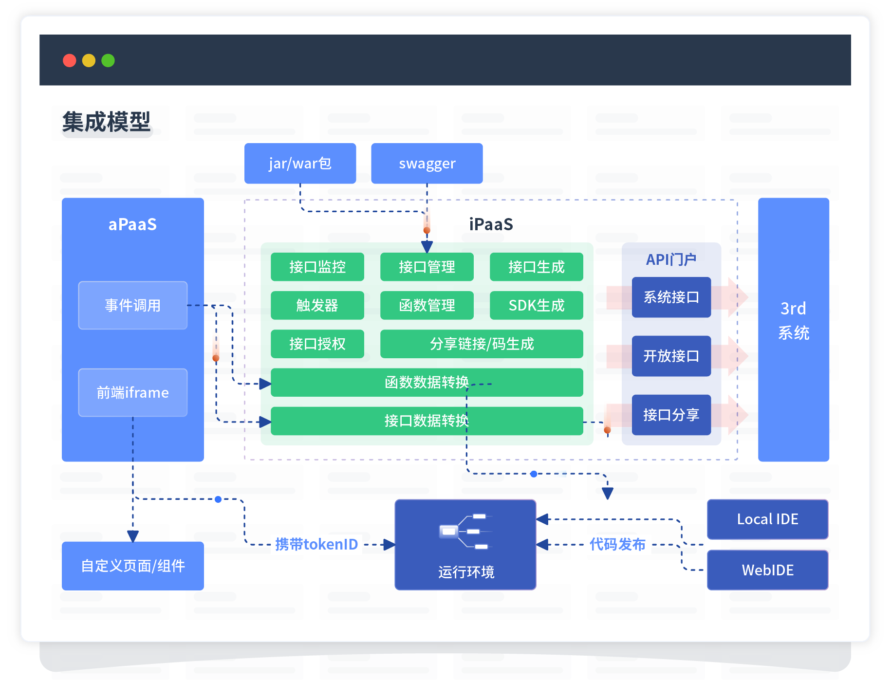 集成模型包括平台本身前、、、后端能力的扩展,,,也支持通过API门户和第三方系统进行交互。。