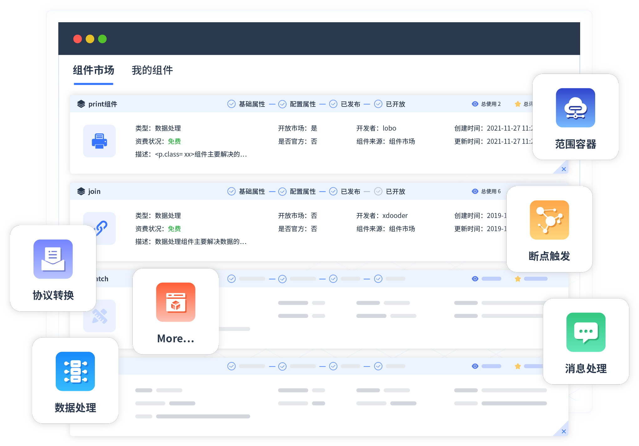 针对集成场景,,,CGPAY钱包提供组件市场,,例如协议转换、、、、消息处理、、、文件操作等。。。。除平台提供的组件外,,,,客户可以自定义所需组件。。