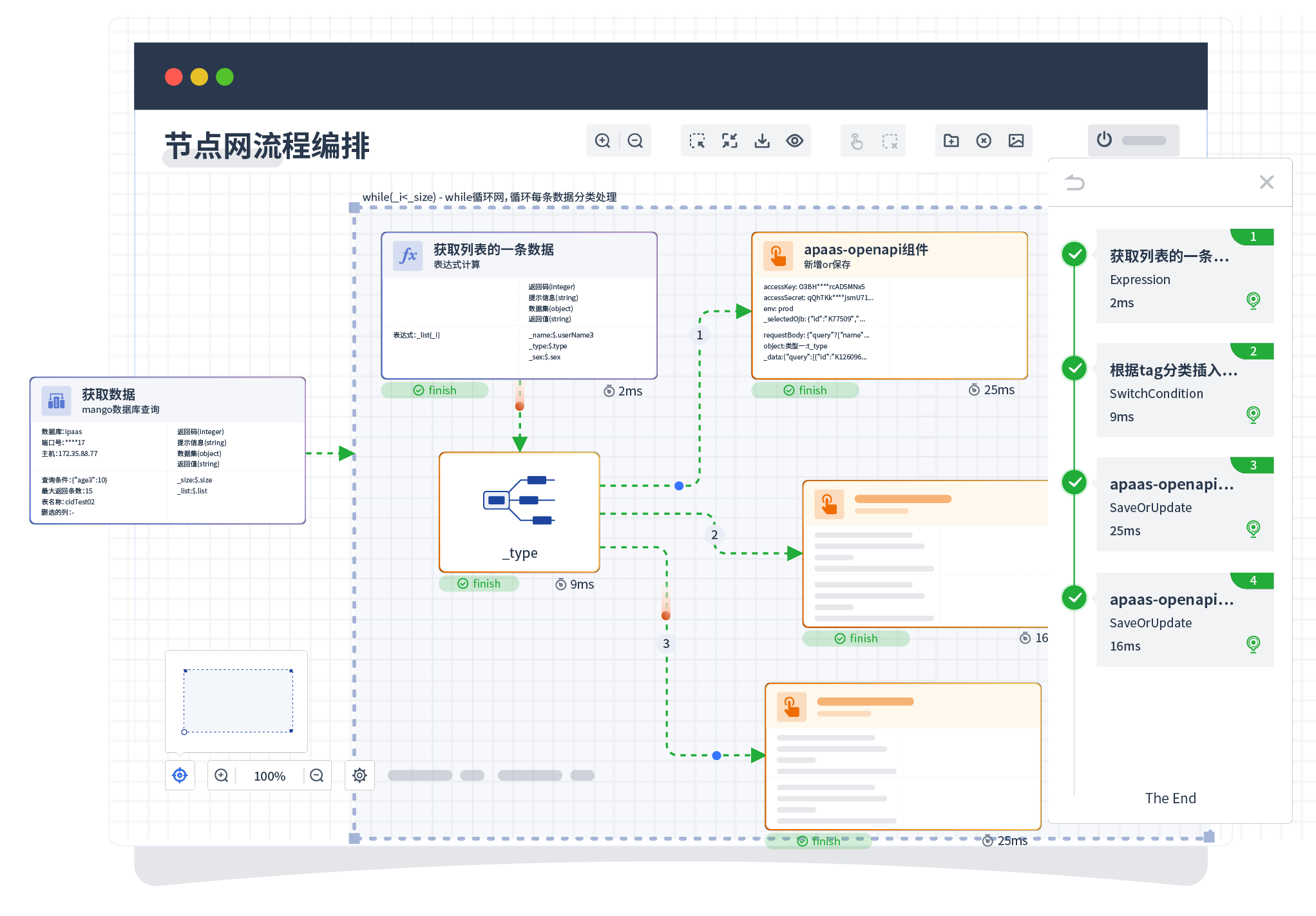 针对集成场景,,,,组件定义后支持进行流程编制,,不同于传统代码方式,,通过图形化展示,,,支持在线调试、、、、日志查看和运行回放。。。。